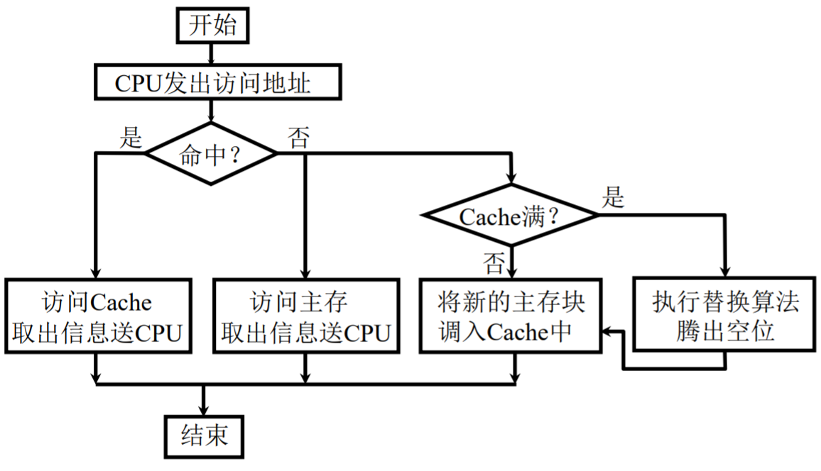 主存字块标记要和Cache中所有字块的标记进行比较,未命中情况下发生替换操作。两个操作同时进行,电路复杂、速度慢