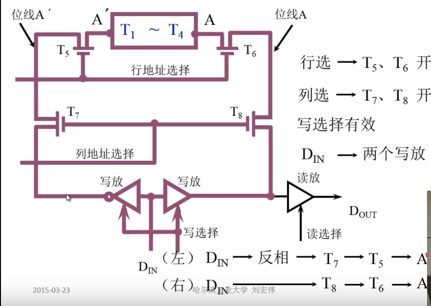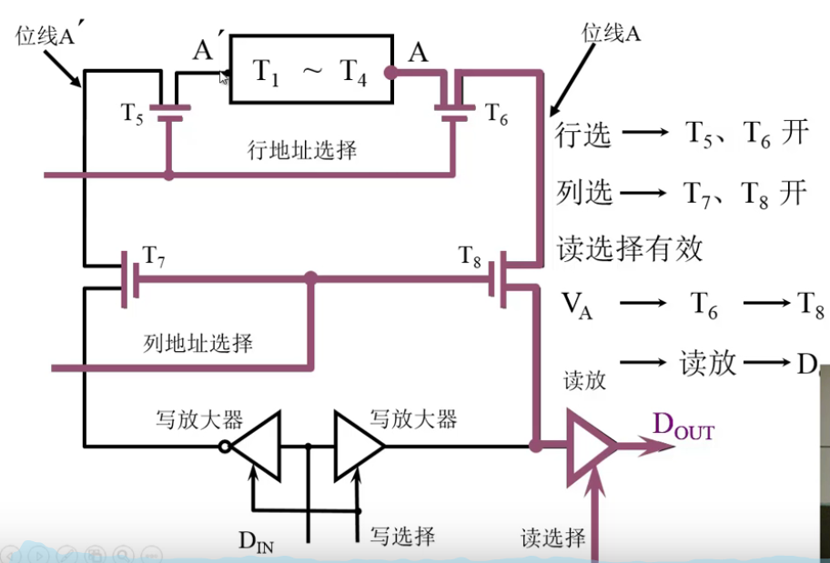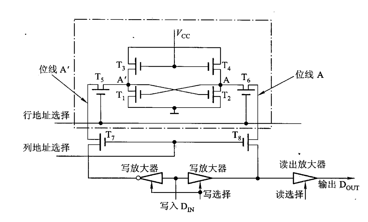 T7 和 T8 受列地址选择控制,分别与位线A’和A相连。他们并不包含在基本单元电路中,而是芯片内同一列的各个基本单元电路所共有的