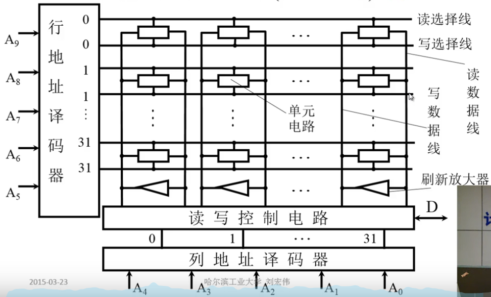 1K个存储单元,存储字长为1位,共10根地址线被分成了5根行地址线和5根列地址线