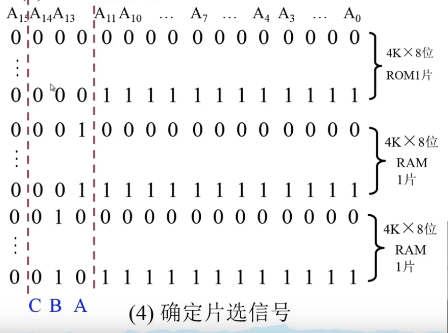 观察上图,我们现在有4组芯片组,每组芯片分配一个地址范围,并将每组芯片连接在同一个片选线上。