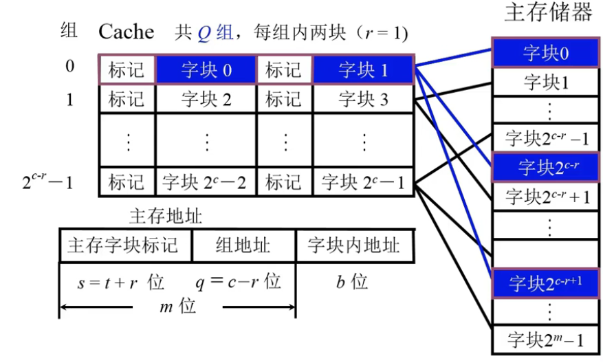 在对Cache划分字块的基础上,对其进一步划分,划分成一个个组,假设共 Q 组,每组若干个字块(图中设为2个)