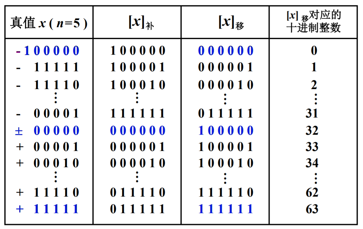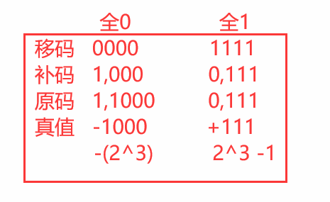 移码全0表示的是最小值 $-(2^{n-1})$ 全1时表示最大值 $2^{n-1}-1$如下图
