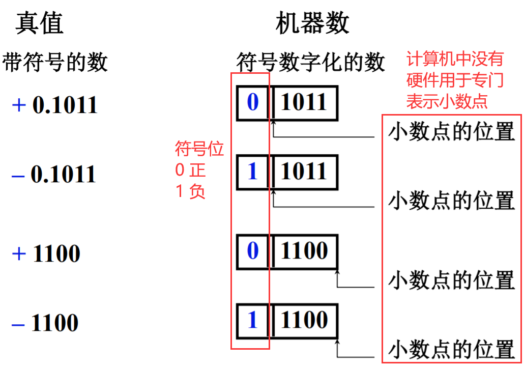 计算机中,没有为小数点设置专门的存储逻辑。小数点的位置是以约定的方式给出的。当约定小数点在某一指定点时,这就是定点表示。