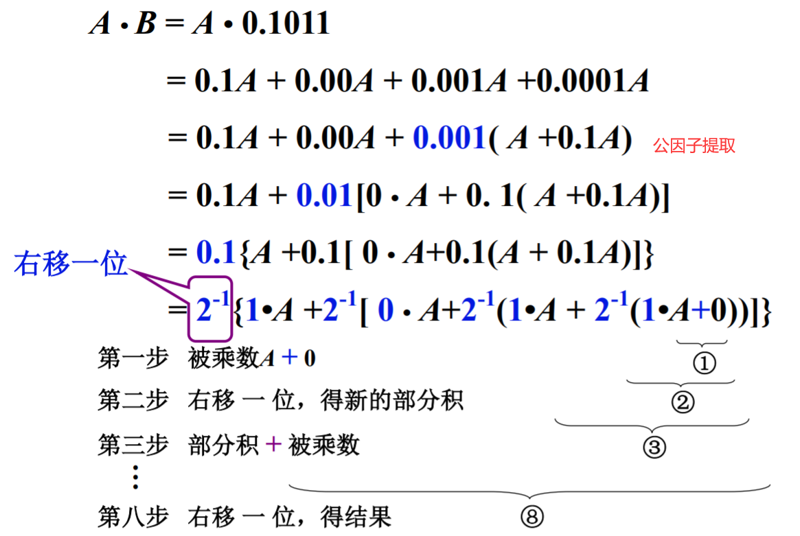 由乘数的末位决定被乘数是否与原部分积相加, 然后 右移1位 形成新的部分积,同时 乘数 右移1 位 (末位移丢),空出高位存放部分积的低位。