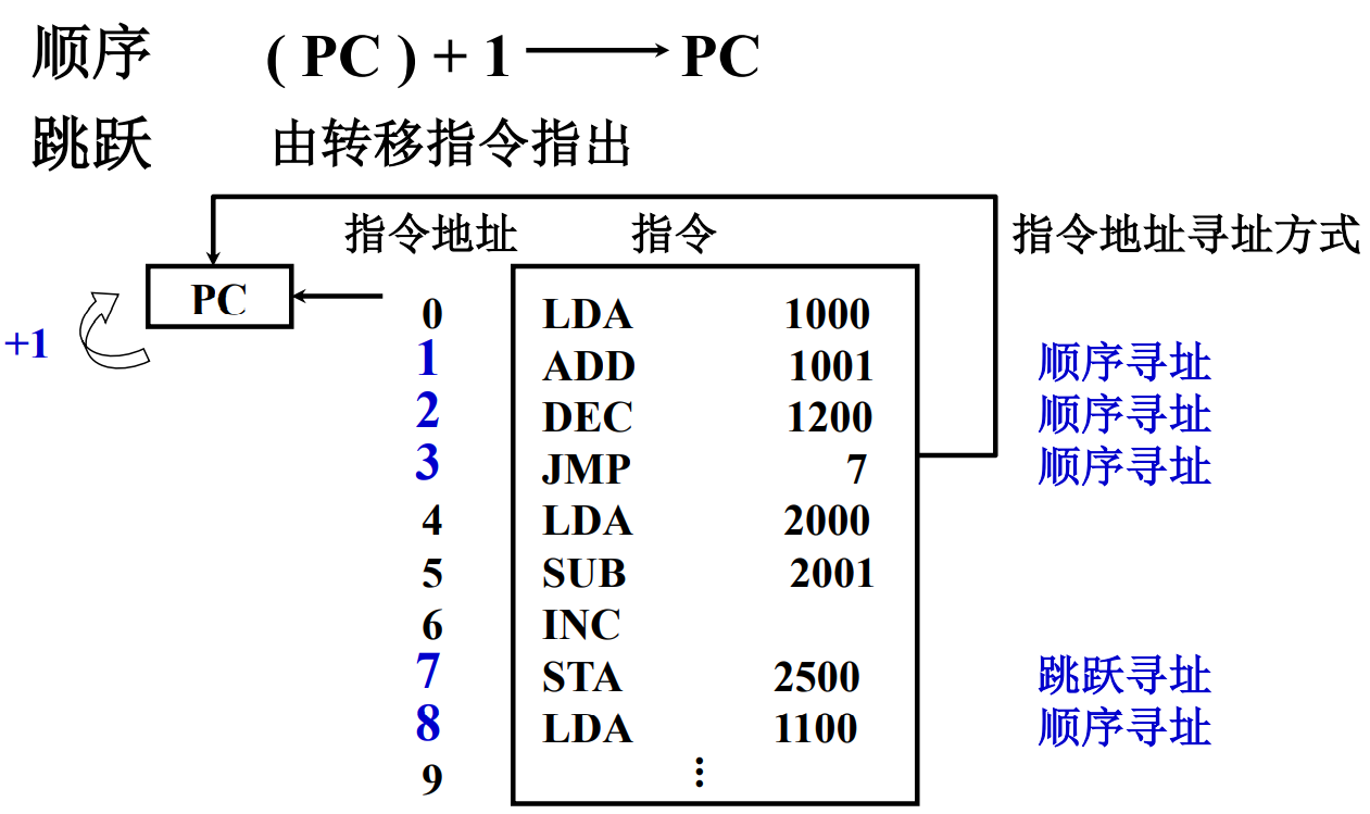 顺序寻址:PC指令计数器实现,每条指令执行后,PC+1,得到下一条指令地址