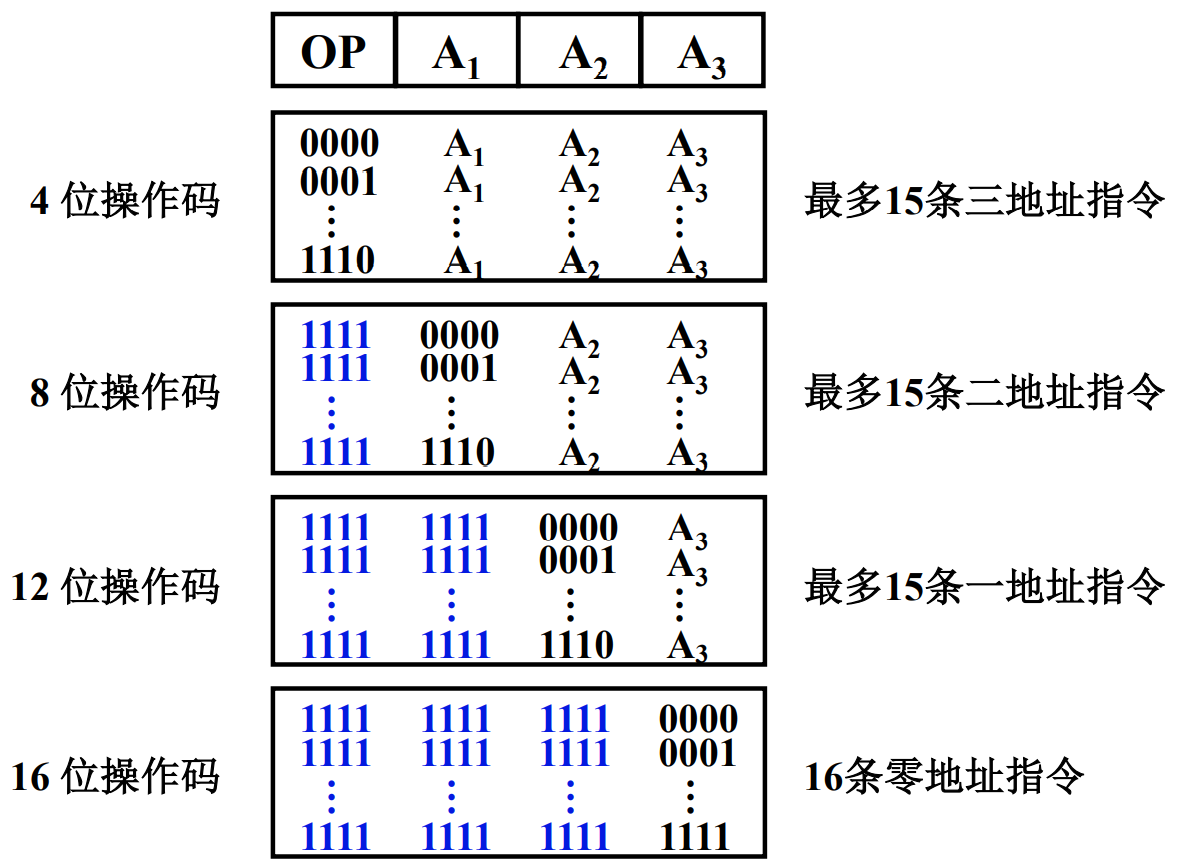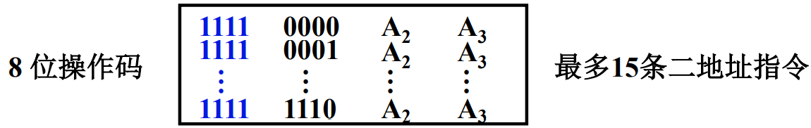 4位操作码能够生成的指令原本应该是16条,但这里仅使用了15条。原因就在于:保留了操作码1111作为扩展标志,假如OP使用的是1111,就代表占用了地址码 A1进行扩展操作码,操作码就成为8位,如下图所示: