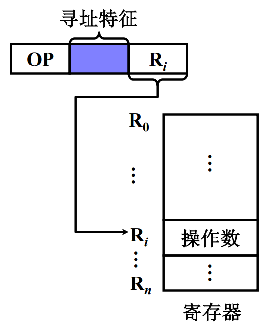 特征: EA=(Ri),形式地址A保存寄存器地址 Ri,寄存器保存操作数真实地址。