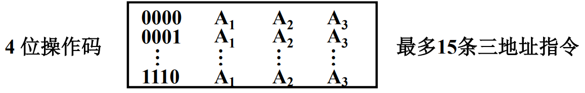 如图,假设一条指令包含了1个操作码和3个地址码,指令字长为16位,操作码占4位。如图: