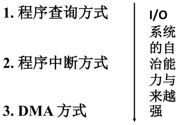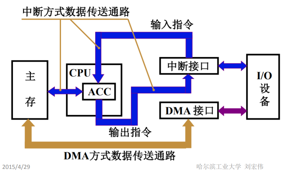 这一阶段,I/O接口和DMA控制器与CPU相互配合,完成输入、输出操作。I/O设备和CPU信息交换传输控制方式有两种: