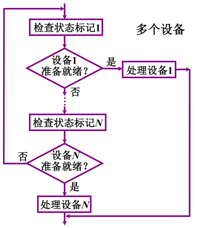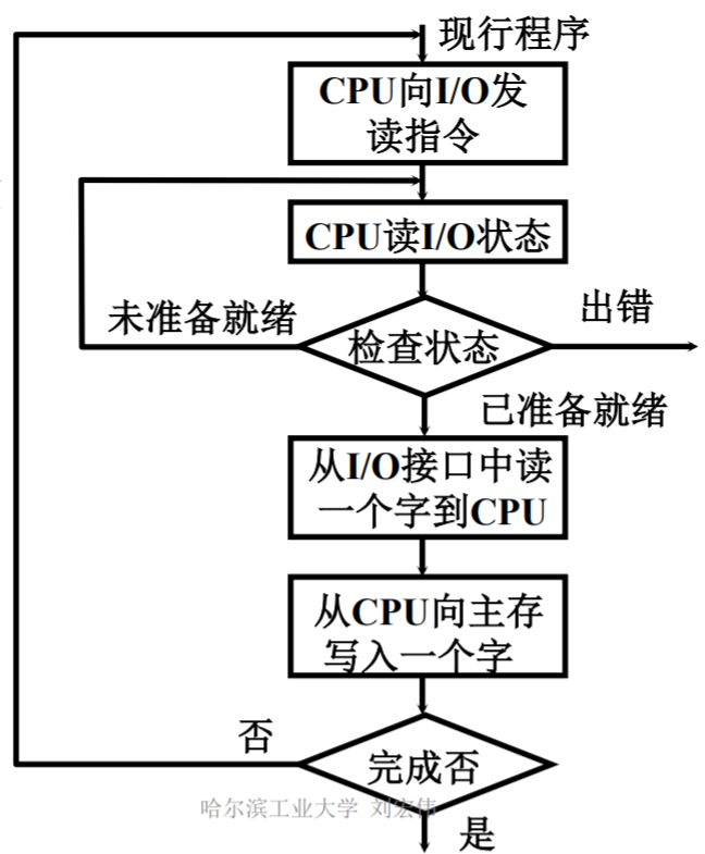 CPU和I/O设备以程序查询方式进行连接,串行工作