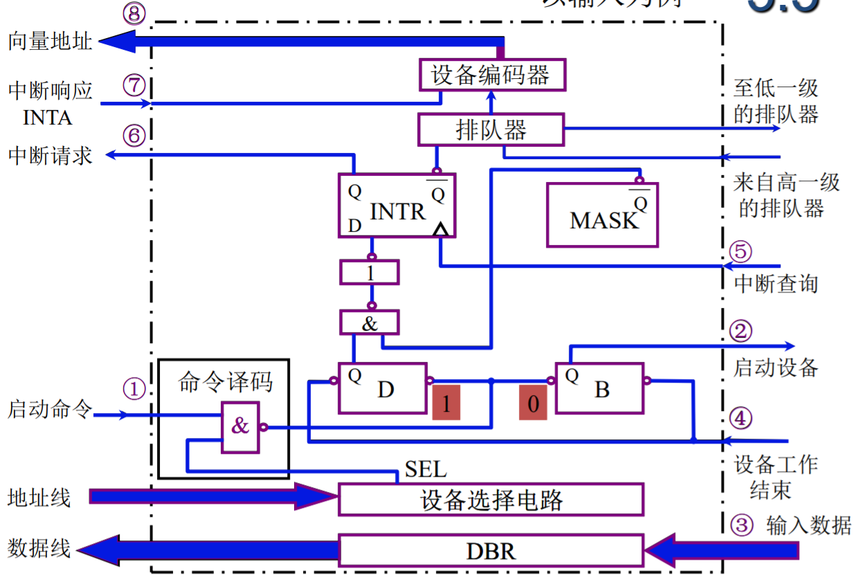⑧:计数器溢出时(全0),表示一批数据交换完毕,WC向中断机构发出溢出信号,(INTR被置为1)中断机构向CPU发出中断请求信号。CPU响应中断请求后,通过执行中断服务程序来进行后处理