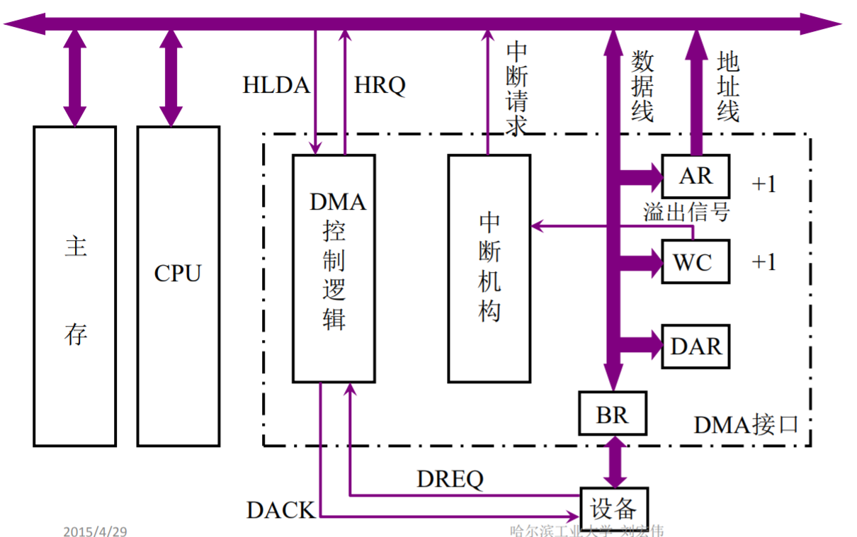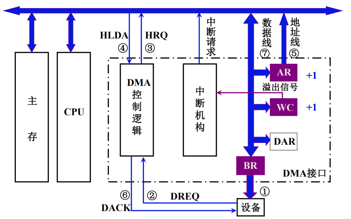 ⑦:BR中的数据经数据线传输给主存,在这个过程中,每传输一个字: AR+1,WC+1,同时判断是否传输完成,未完成就继续。从步骤 1 开始